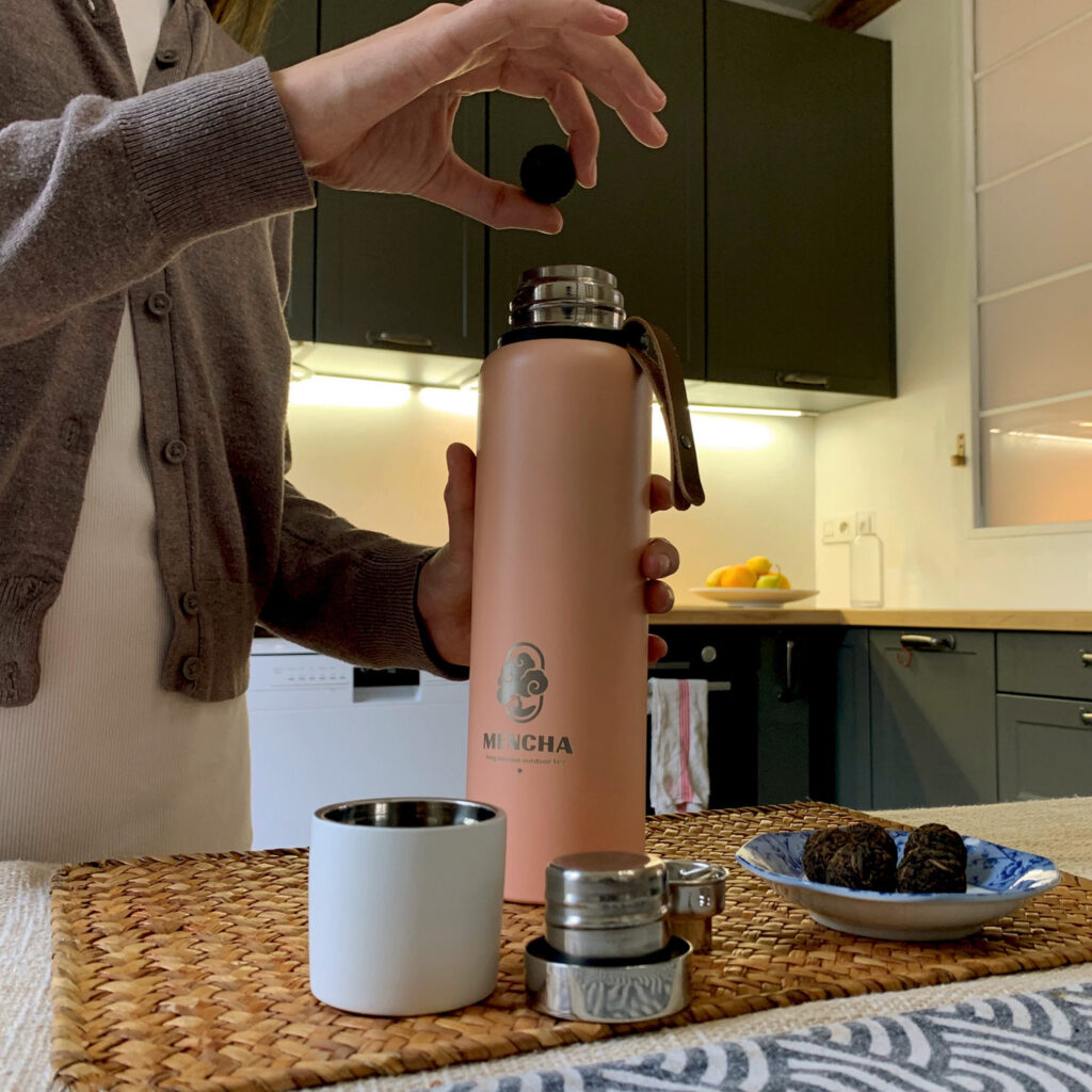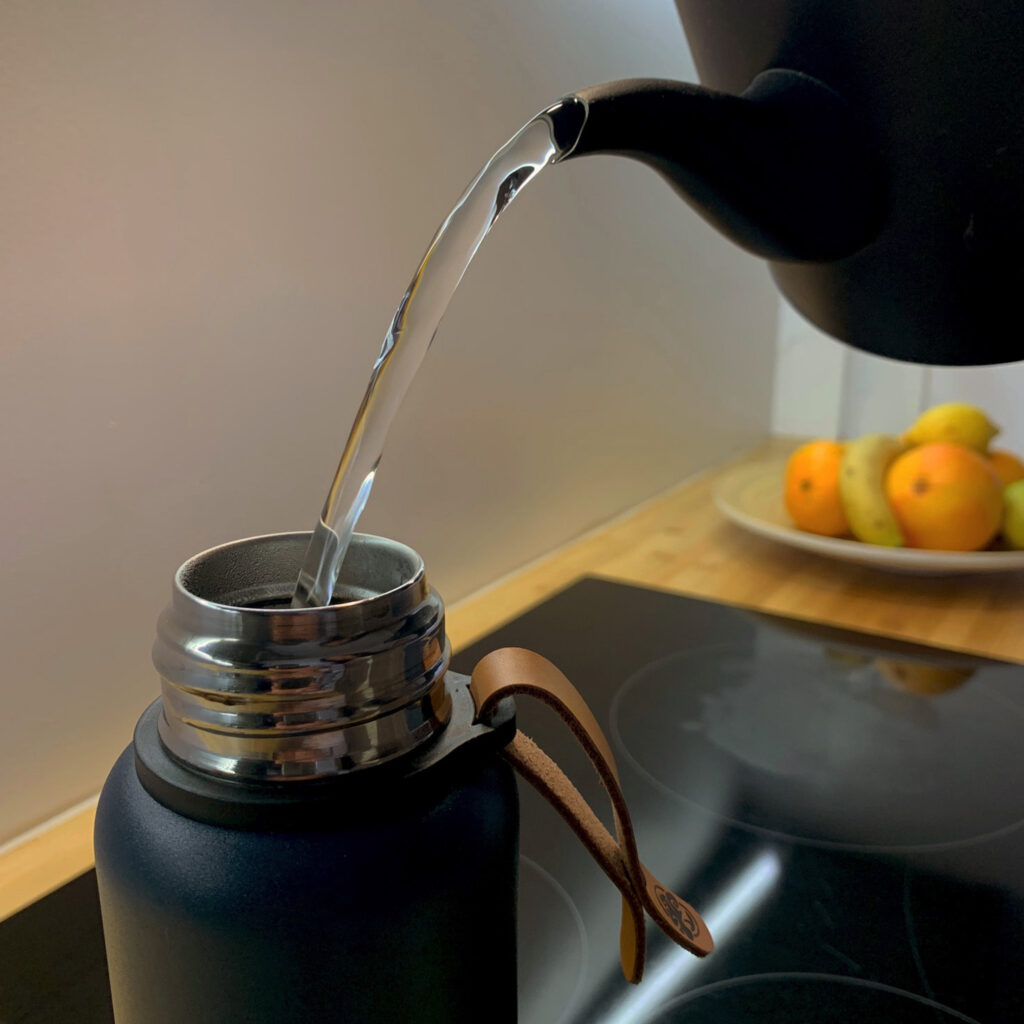 1 – Le matin (2 minutes) : Mettez une Tchaball dans votre bouteille isotherme + eau chaude